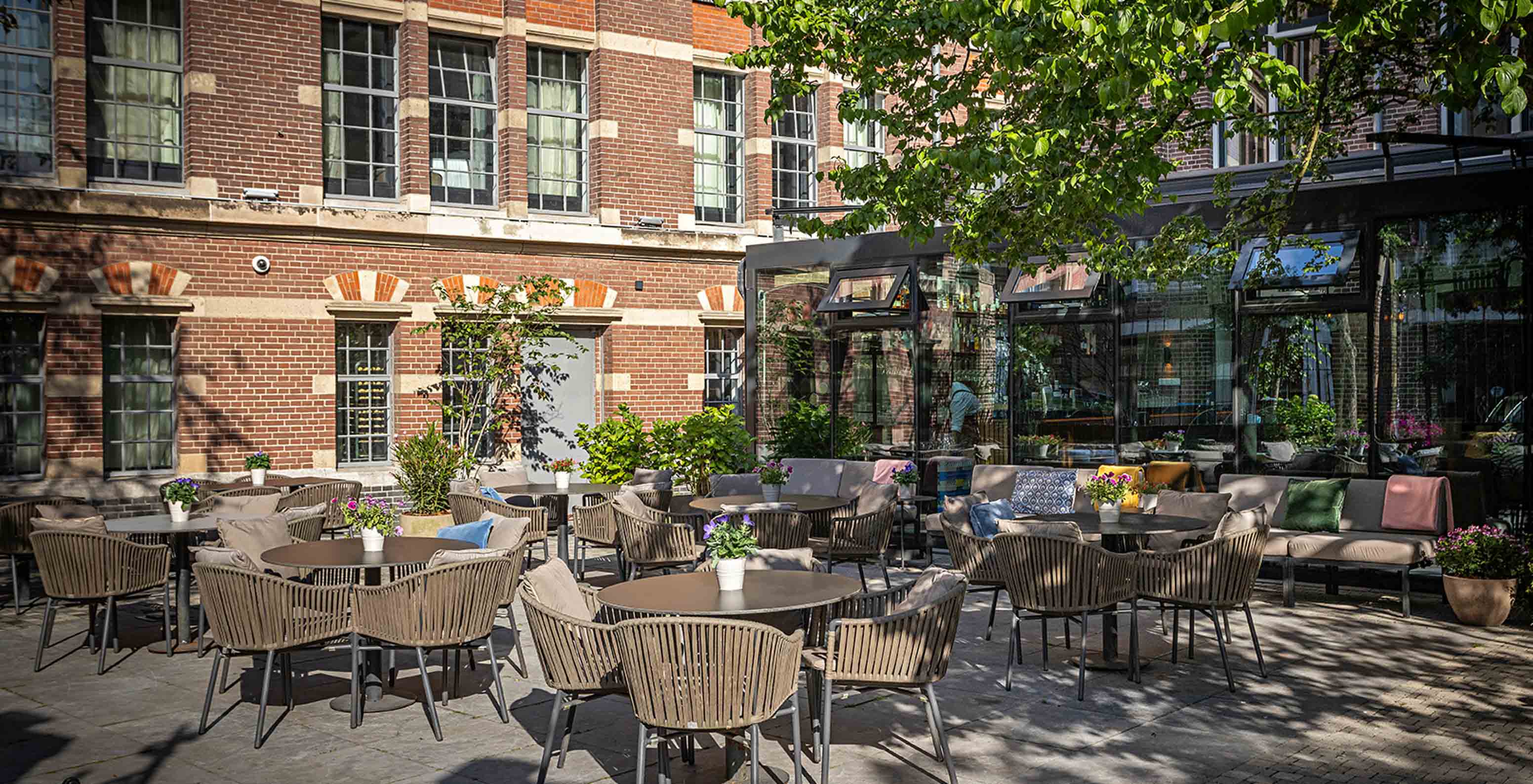 O Pestana Amsterdam Riverside, Hotel no Centro de Amesterdão, tem um terraço com várias mesas e cadeiras, e árvores à volta