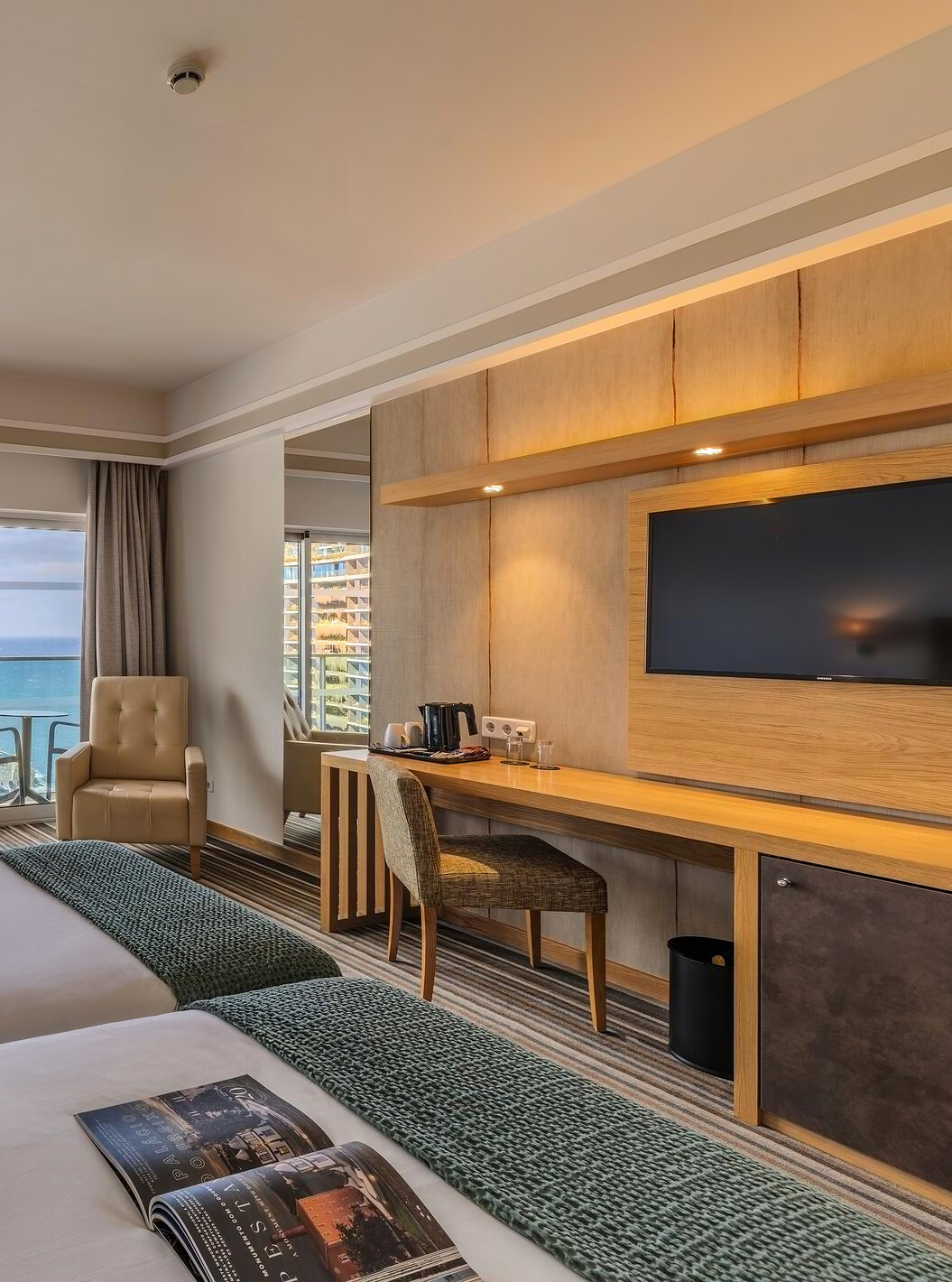 As zonas de relaxamento chamam por si, tal como o ginásio, a sala de massagens e a piscina interior, com as suas dezenas de espreguiçadeiras e vista frontal para o mar.