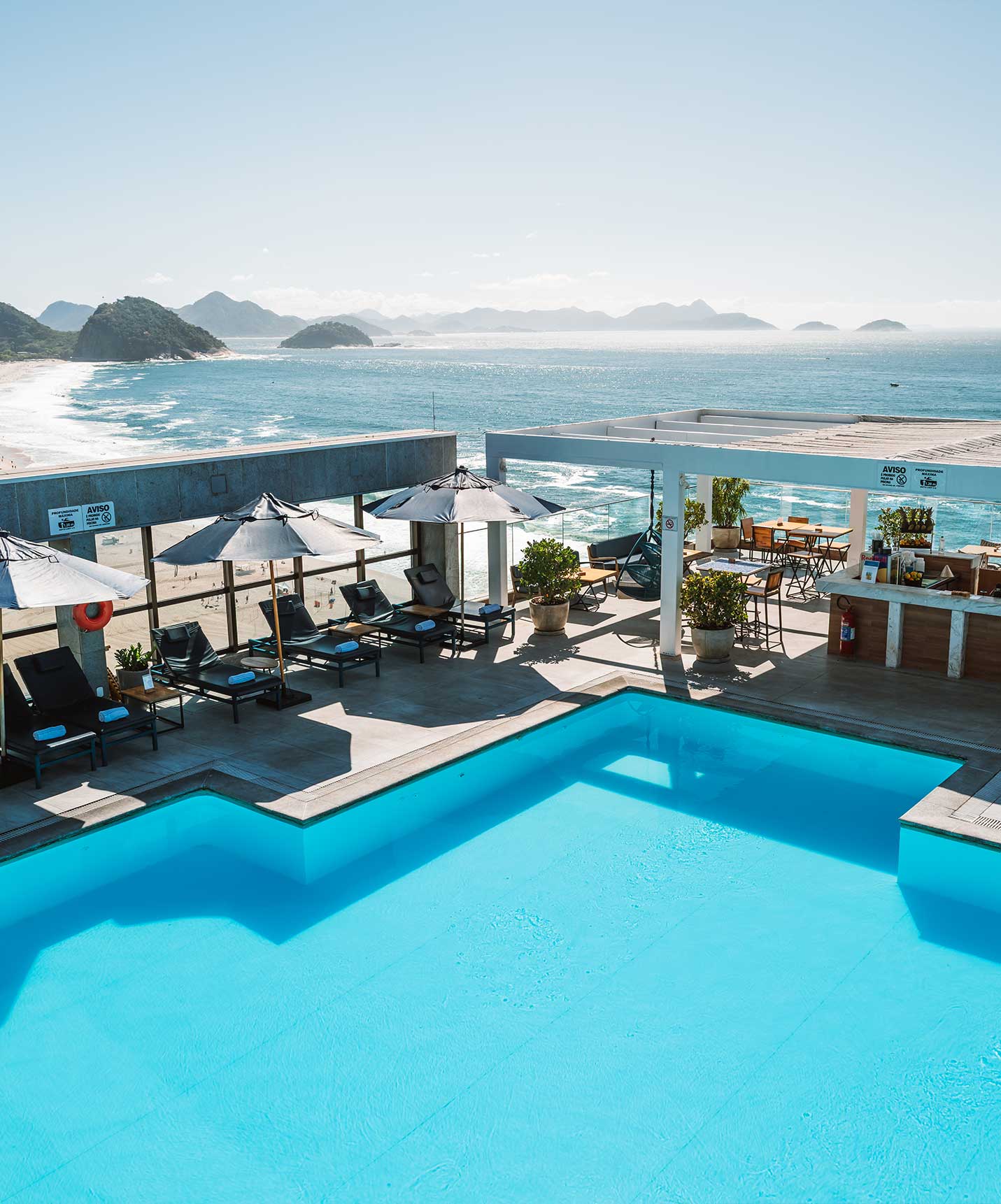 Rooftop do hotel 4 estrelas no Rio de Janeiro, com espreguiçadeiras com toalhas e vista para a Praia de Copacabana