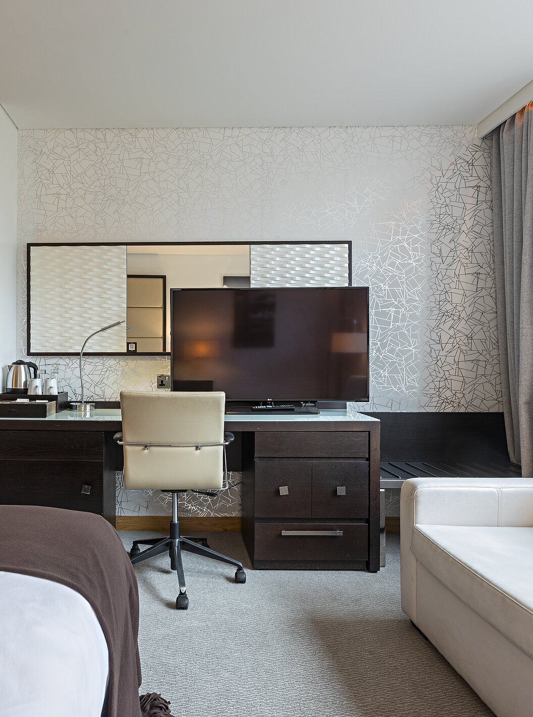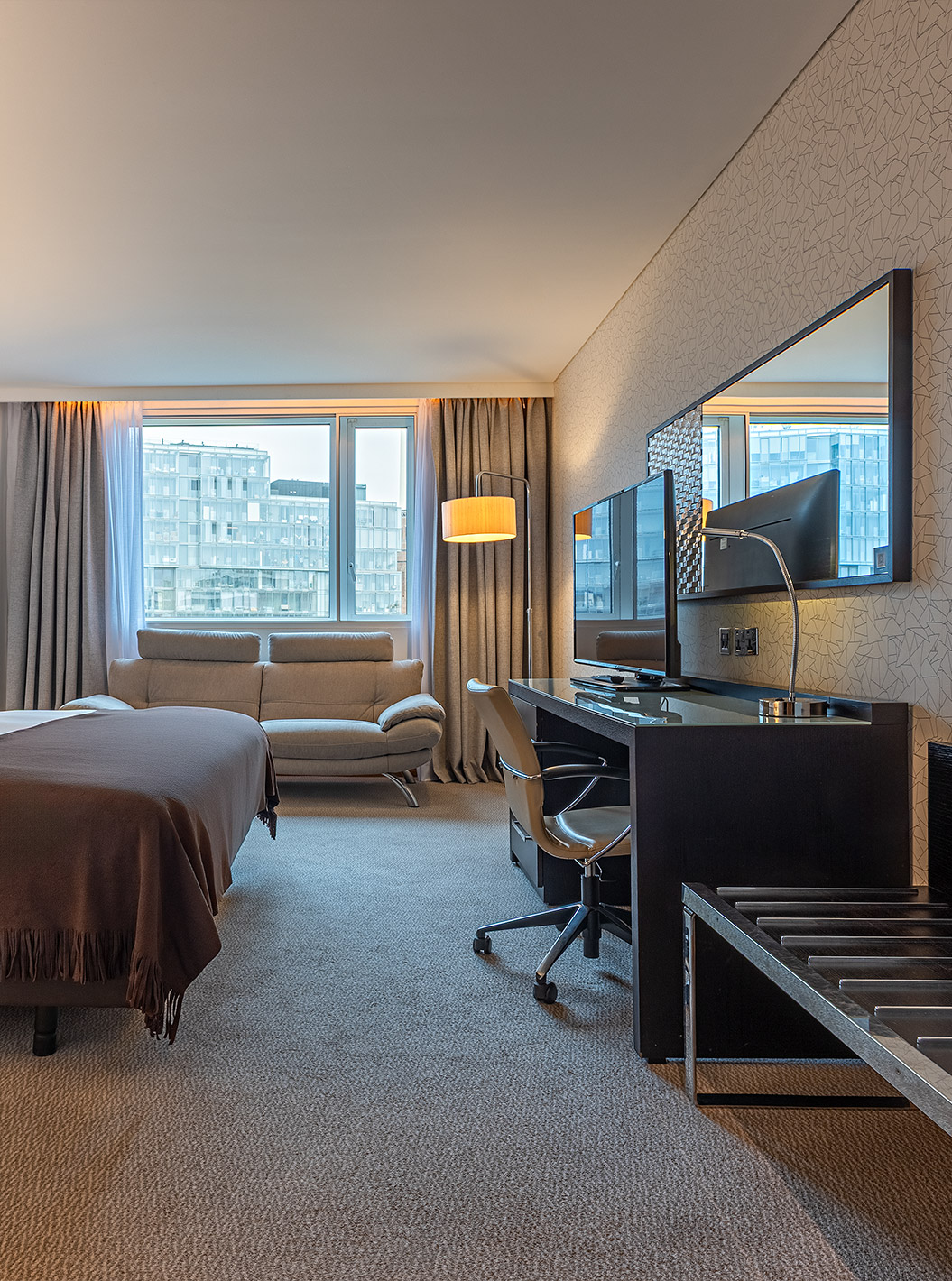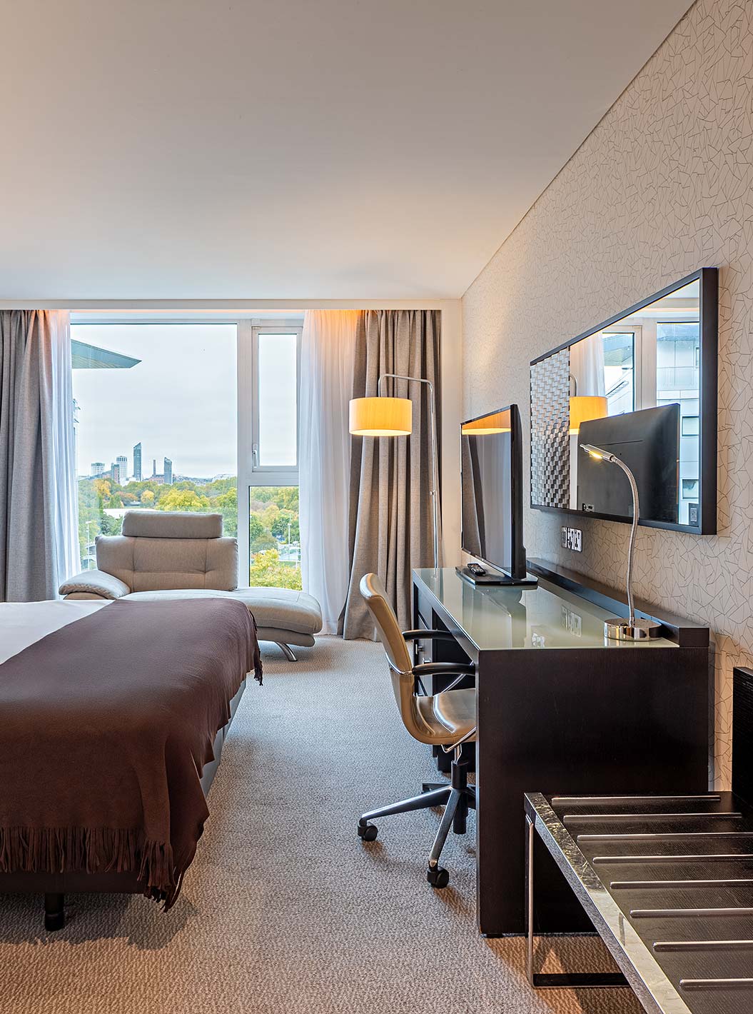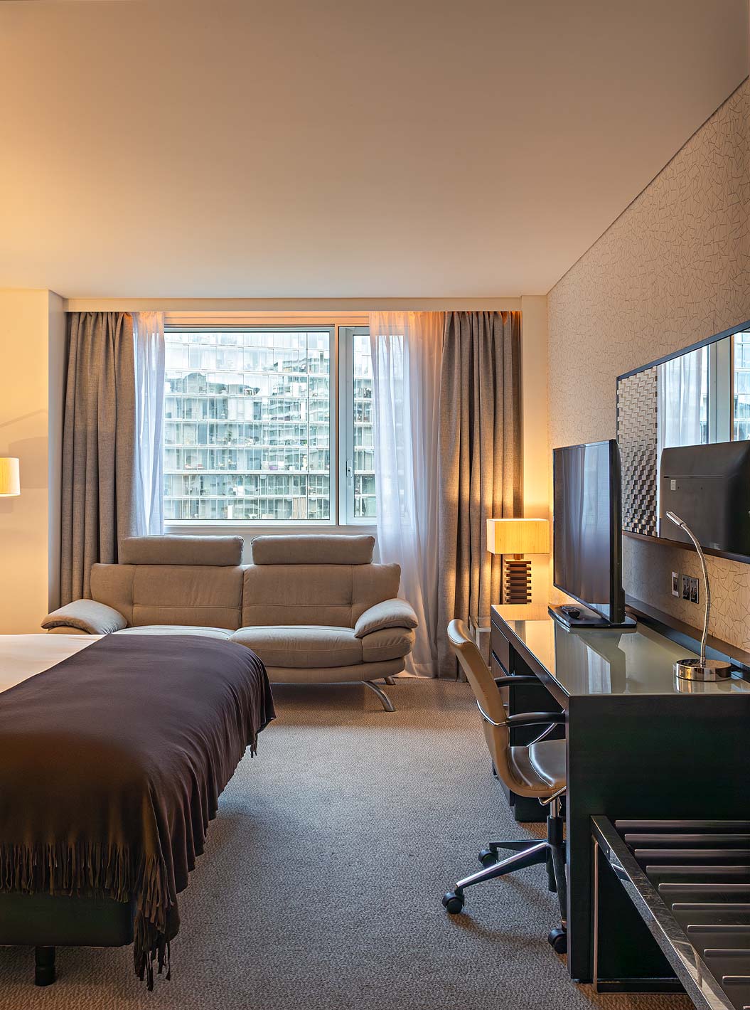 Kamer met tweepersoonsbed, tv, spiegel, grote ramen met uitzicht over Londen
