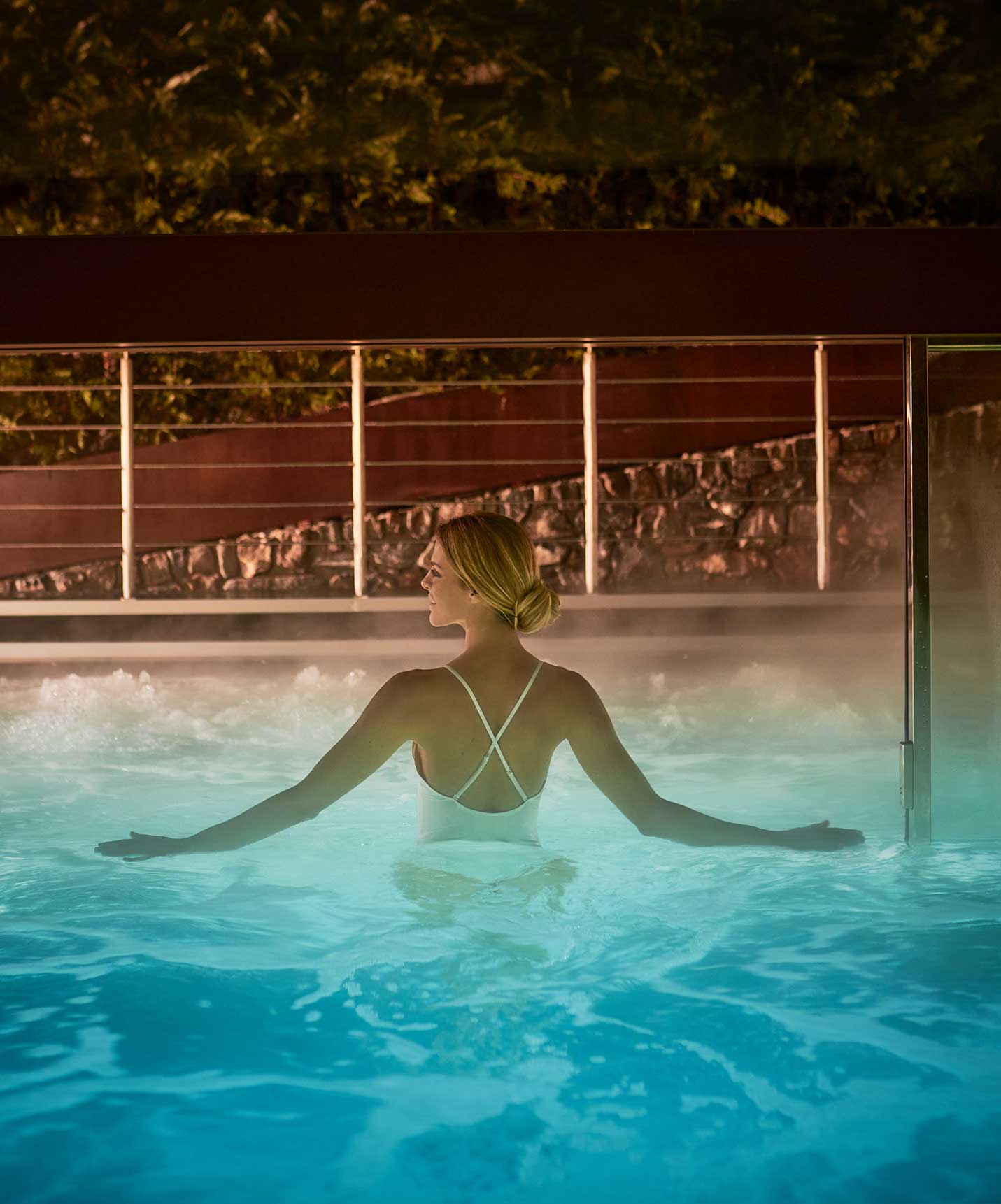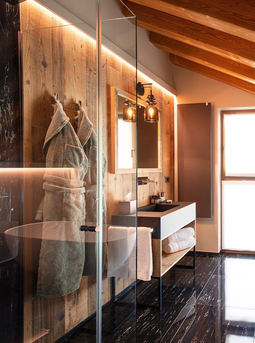 The spa at Le Massif Courmayeur is a wellness retreat inspired by the energy of the mountains. The spa features indoor and outdoor water circuits, indoor and outdoor saunas, a Turkish bath, and a jacuzzi.